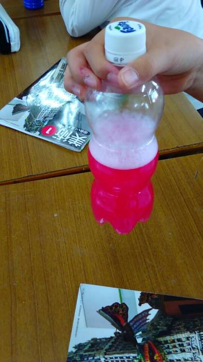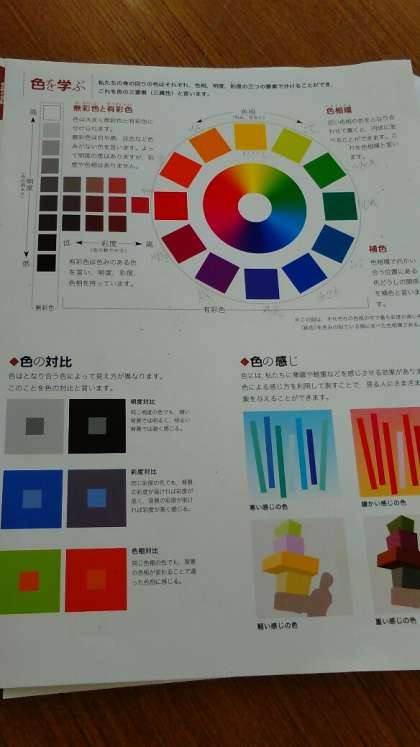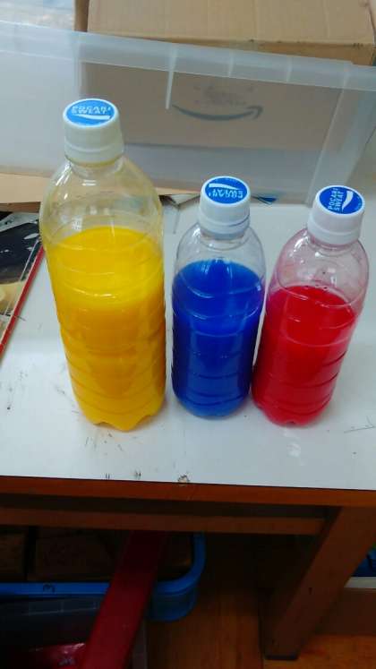 色の学習。赤、青、黄の3色を混ぜていろいろな色を作っています。