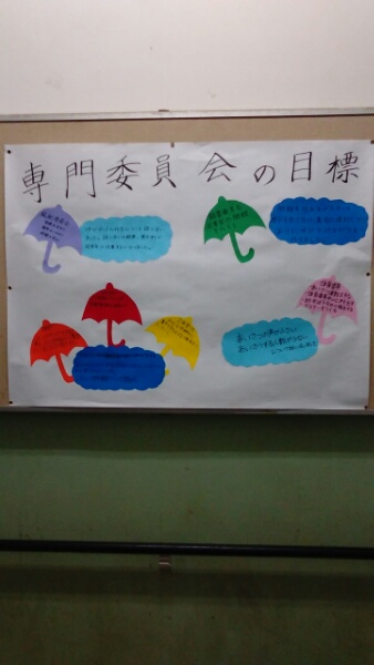 生徒専門委員会で話し合われた目標と対策が掲示されています。