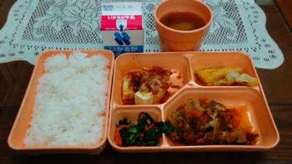 明日から懇談のため、1学期の給食は今日が最後になります。献立は、牛丼、冷やっこ、かぼちゃのてんぷら、小松菜とにんじんのおひたし、みそ汁です。