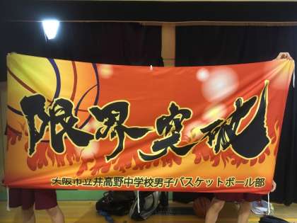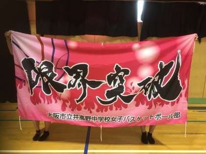 男女バスケットボール部の横断幕を保護者会が作成してくれました。部のスローガンである「限界突破」の4文字が輝いています。勝つことだけでなく、何事にも人間として限界まで挑戦し大きく成長してくれることを願っています。この横断幕を掲げ、夏の大会に挑みます。