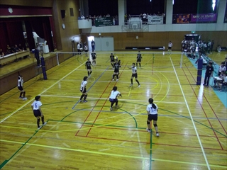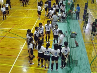 16日(日)平野北中会場で、試合に臨みました。1回戦は意岐部中に2−0で勝利、2回戦も貝塚四中に2−0で勝利しました。暑い体育館でしたが、3年生を中心に全員でよく頑張りました。〔写真は2回戦の様子、白いユニフォーム〕