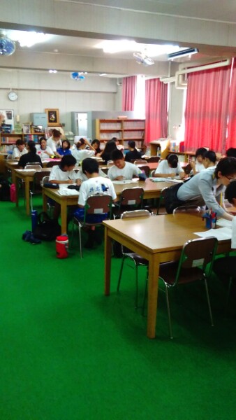 8月になりました。今日から3日間は1年生の学習会です。図書室に30名近くの生徒が集まり、宿題や苦手な教科の学習をしています。学びサポーターの方々にも来ていただき、わからないところを教えてもらっています。明日と明後日も9時から行うので、積極的に参加しましょう。