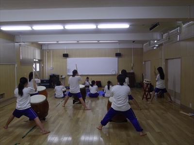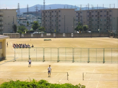 武道場では剣道部、4階では吹奏楽部が練習をしています。陸上部の合同練習ももうすぐ終わりそうです。テニス部は、男女で練習と学習会を交互に行っています。体育館では男子バスケット部が汗を流しています。太鼓部は、5日(土)6日(日)の納涼大会出演のため最後の仕上げに入っています。