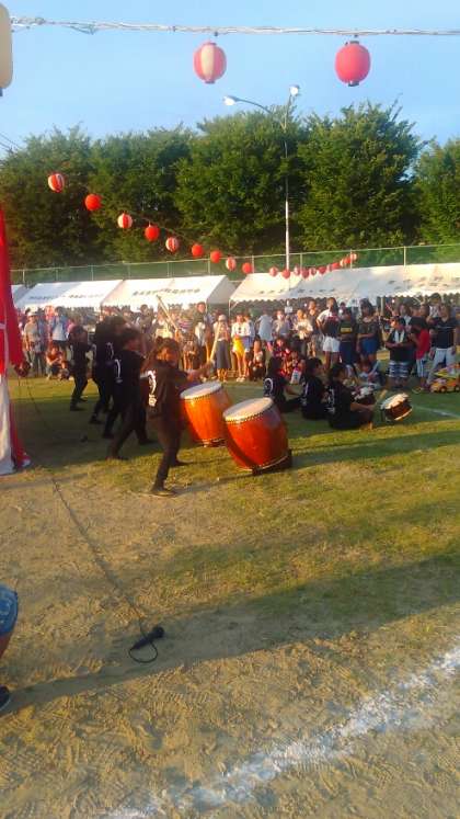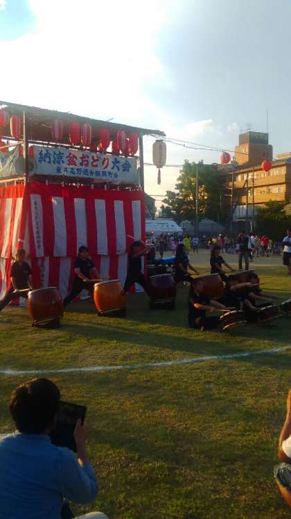 東井高野納涼大会に太鼓部が出演しました。夕陽が照りつける中、堂々と演奏しました。