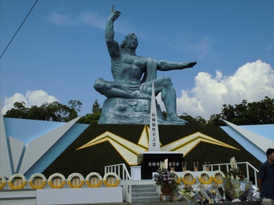 〔平和祈念像の右手は原爆の脅威を、左手は平和を、軽く閉じた目は原爆犠牲者の冥福を祈る気持ちを表しているそうです。〕