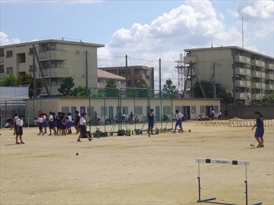 お盆も終わり、たくさんの部活動が再開しました。今日はグラウンドで陸上部が東淀中と歌島中と一緒に総勢約80名で合同練習、男子ソフトテニス部は、市内だけでなく、府下や兵庫県の中学校にも来てもらい「北摂カップ」を実施しています。午後からは野球部が西淀中と合同練習です。体育館では、午前中、男女バレーボールが汗を流し、午後からは卓球部が摂津二中と練習試合を行っています。校舎内では、吹奏楽部が熱心に練習をしています。