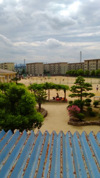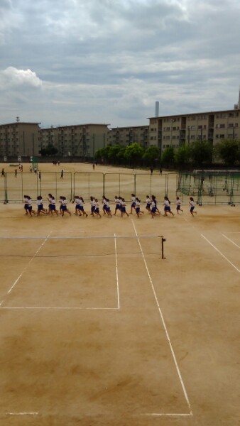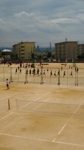 グランドでは陸上部が他の学校と合同練習をしています。テニスコートでは女子ソフトテニス部が明日の公式戦に向けて練習をしています。今日は卓球部が公式戦に出かけています。