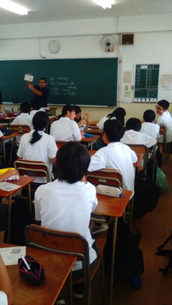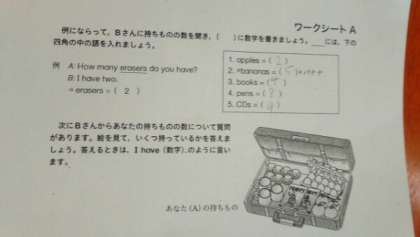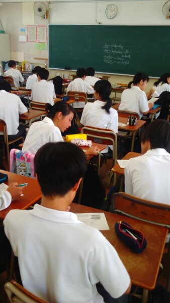 1年生の英語の授業です。C−NETの先生の指示のもと、ワークシートを見ながら隣どうしで英会話をしています。