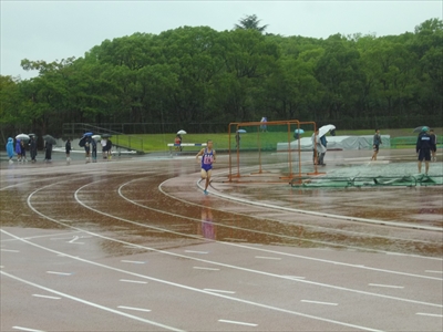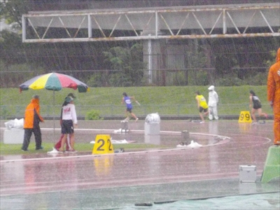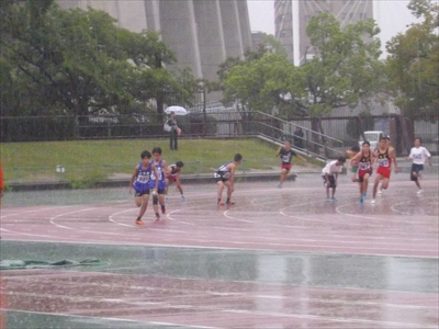 大阪市秋季総体、陸上競技の部が16日(土)に行われました。従来は16日(土)17日(日)の2日間開催なのですが、17日(日)に近畿地方へ台風が接近するため、今年は1日の開催となりました。前日に競技ダイヤも変更になりバタバタとたいへんでしたが、選手たちは雨の中健闘しました。(写真は上から1年男子4×100mリレーの3走から4走、2年男子3000m、共通女子4×100mリレーの1走の様子です。青いユニフォームです)