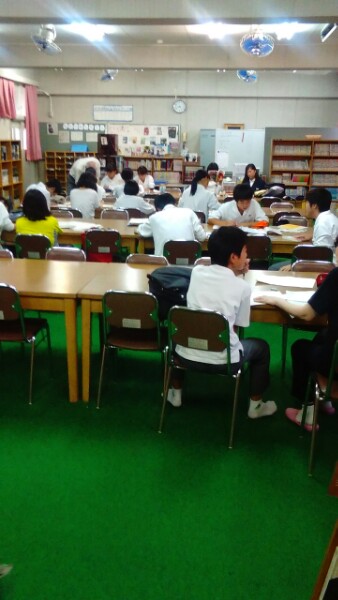 先週から放課後に図書室を「学びのスペース」として開放しています。今日も20人以上の人が学習に励んでいます。わからないところは、学びサポーターの方から教えてもらっています。学習用プリントもたくさん置いてあります。明日も開放するので参加しましょう。