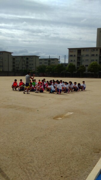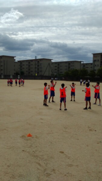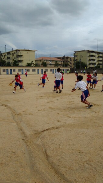 1年生の体育は、フラッグフットボールです。班(チーム)ごとに準備体操をした後、試合をしました。勝つための作戦を工夫しながら活動しています。