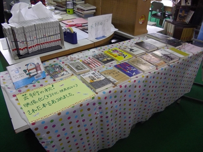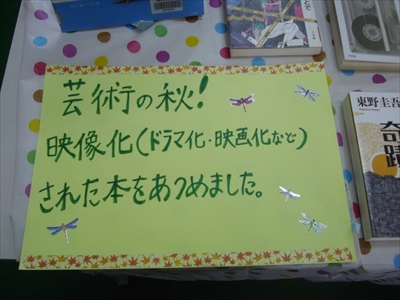 図書室の入口に映画やテレビでドラマ化された作品を集めて展示しています。貸し出しもできるので、興味のある人はぜひ読んでみてください。その中に今話題の作家の本が一冊だけ置いてあります。(ヒント:長崎で生まれ、現在イギリスで執筆活動をされている作家で、先日ある有名な賞を受賞しました。〕