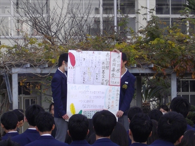 集会の最後に生徒会から、赤い羽根の共同募金を12月12日(火)〜12月15日(金)の日程で行うと協力のお願いがありました。その壁新聞の披露もありました。(写真は、区のキックベースの表彰と壁新聞の披露の様子です。)