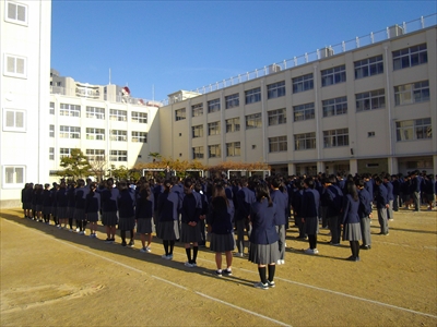 18日(月)全校集会を行いました。寒い中でしたが、校長先生と生徒指導主事の話を真剣に聞きました。最後に生徒会から先週行われた「赤い羽根募金」の報告とお礼がありました。集まった募金は25日に東淀川区社会福祉協議会の方に取りにきていただきます。協力していただいたみなさん、本当にありがとうございました。