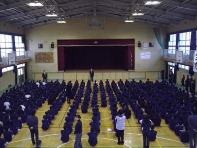 9日(火)始業式を行い、いよいよ3学期が始まりました。12月の終業式よりもさらにいい状態で、学校長、生徒指導主事の話をしっかり聞くことができました。式の前に男子テニス部と男子バスケットボール部の表彰を行いましたが、全校生徒が仲間の活躍をしっかり拍手で祝福するいい雰囲気でした。新年の節目にいいスタートが切れました。