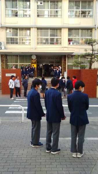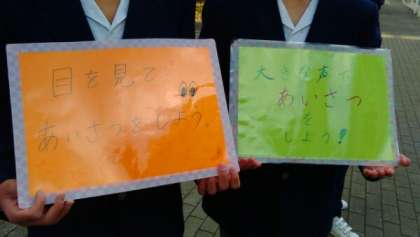 あいさつキャンペーンも最終日です。生徒会や専門委員など有志でたくさんの人が正門に集まりました。