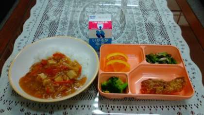 献立は、マーボー丼 赤魚のから揚げ チンゲンサイとしめじの炒めもの ブロッコリーの中華あえ オレンジ です。