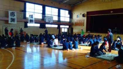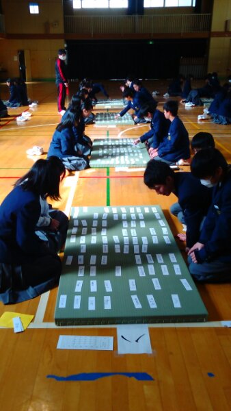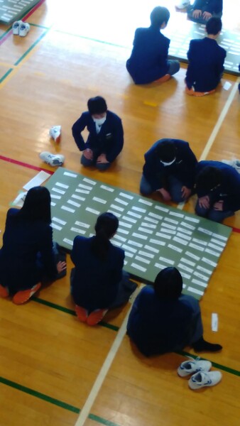 1年生は、5・6限に英語カルタ大会をを行いました。この日までに、100枚の英単語カルタをつくり、覚えながら練習を重ねてきました。英語の選手宣誓の後に試合開始です。