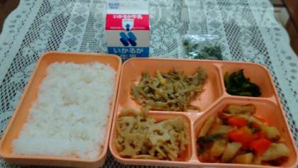 献立は、鶏ごぼうご飯、赤平天とだいこんの煮もの、れんこんのそぼろ炒め、小松菜のおひたしです。
