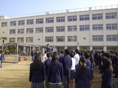 26日(月)全校集会を行いました。校長先生、生徒指導主事の話の後、生徒会役員から挨拶運動後に取ったアンケート公表についての連絡がありました。アンケート結果を玄関のところに貼っていますので、是非ご覧ください。