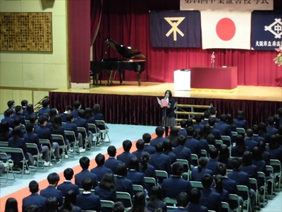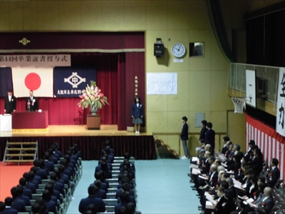 第44回の卒業証書授与式が厳かに行われました。144名が立派に井高野中学校を飛び立って行きました。〔写真上:証書授与開始の様子 写真下:2年生の送辞の様子〕