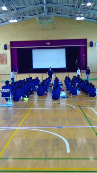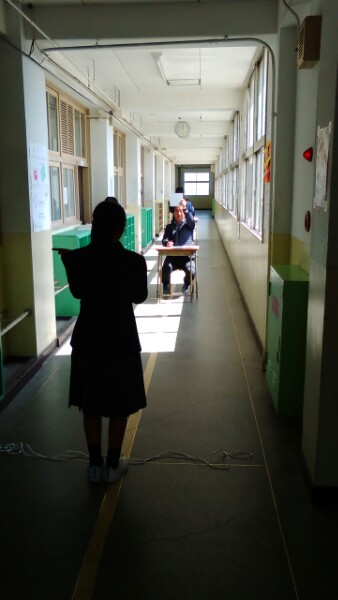 体育館で1年生のオリエンテーションを行っています。下は、視力検査の様子です。