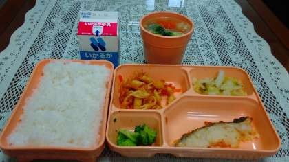 献立は、チキンポトフ(フランスの煮こみ料理)、ブロッコリー、白身魚のムニエル、ミートペンネ、キャベツのピクルスです。