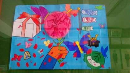 玄関に掲示してある美術部の作品です。テーマは「5月」です。