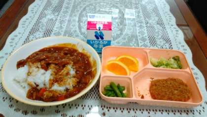 給食の献立は、ポークハヤシライス、グリーンアスパラガス、野菜コロッケ、キャベツとピーマンの炒めもの、オレンジです。