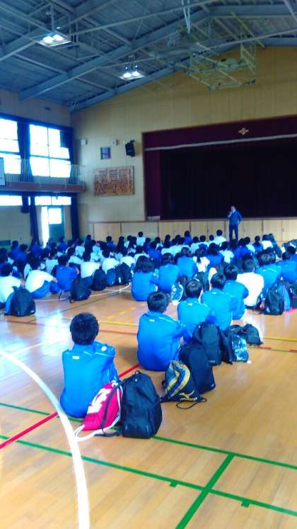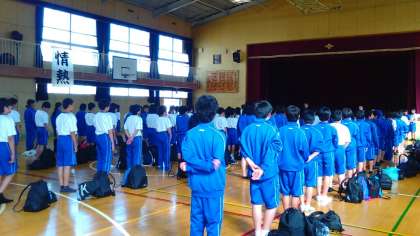 体育館で解散式を行っています。大きな怪我等なく、無事帰校しました。