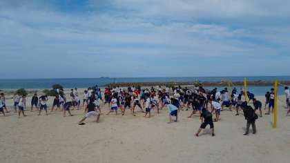 海をバックに全体写真を撮り、その後準備体操をしています。