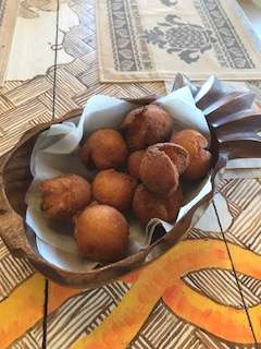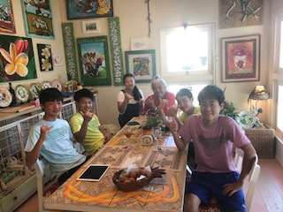 手作りの家、手作りのTシャツ、そして生徒たちが一緒に作ったサーターアンダギーです。