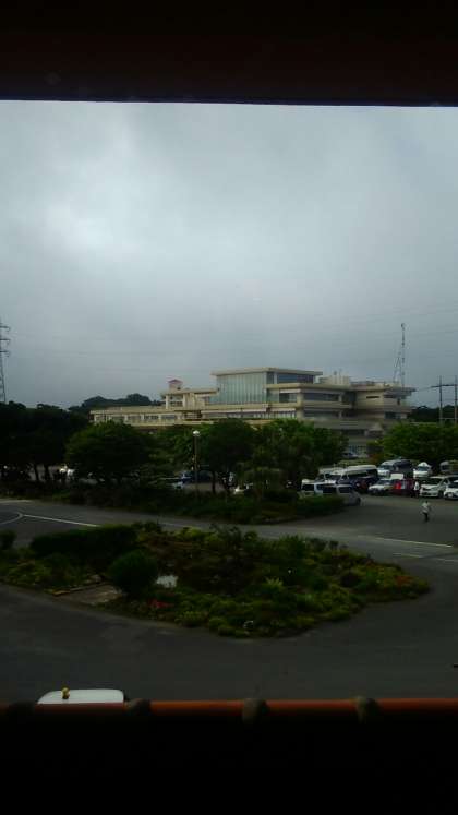 修学旅行3日目。曇りで気温は26℃、湿度88%です。みんな元気に民泊の朝を迎えています。写真は昨年建てられた南城市役所です。