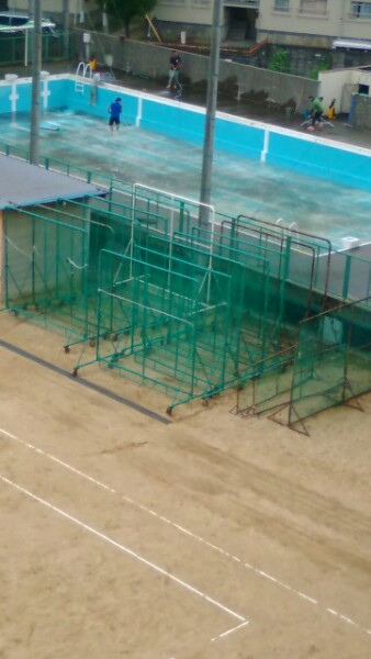 来週からプール授業が始まります。体育の教員と管理作業員さんがプール清掃をしてくれています。