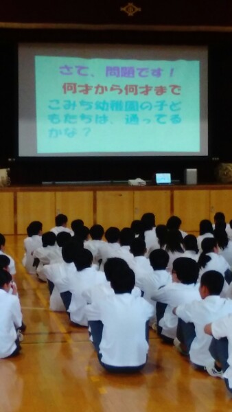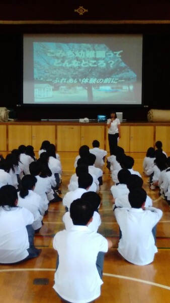 来週2年生は、こみち幼稚園へ幼児とのふれあい体験学習に行きます。今日は、こみち幼稚園の園長先生に来ていただき、幼稚園の様子や気をつけることをお話しいただきました。来週の体験学習がとても楽しみです。