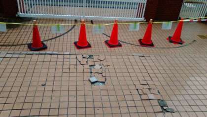 今回の地震で正門付近とエレベーター付近に被害がでています。