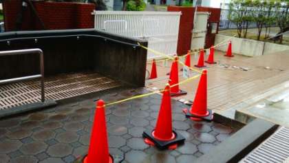 正門を入ったところのタイルがはがれており、通行が危険なためスロープを通るようにしております。また、エレベーターの使用を禁止にしています。