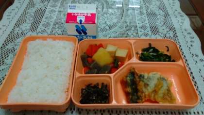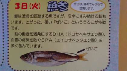 今日の給食の献立は、アジのてんぷら、あつあげとこんにゃくの煮もの、小松菜としめじのあえもの、牛ひじきそぼろです。
