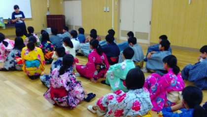 2年2組で日本文化体験を行いました。地域の方々にたくさん来ていただき、浴衣の着付けを教えていただきました。