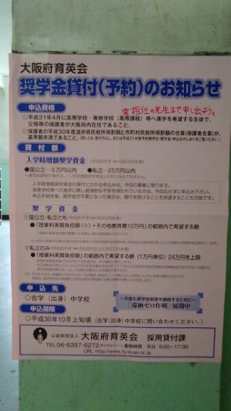 大阪府育英会予約奨学生の募集をしています。3年生にプリントを配付していますが、申し込む場合は早めにご連絡ください。