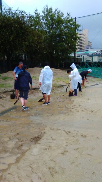 明日の体育大会が実施できるよう、雨の中、排水の道をつくっています。