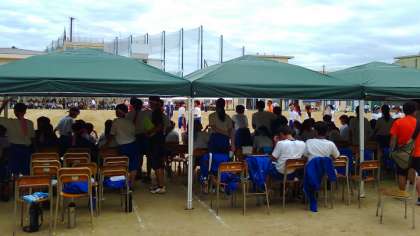熱中症対策で生徒席にテント、自由に飲める水を用意しました。