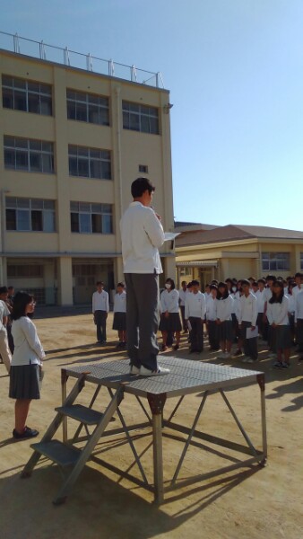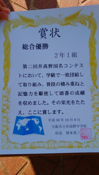 全校集会で、9月21日に行われた国名コンテストの表彰がありました。優勝は2年1組、準優勝は2年3組、3位は3年1組でした。1年生のトップは1年3組でした。