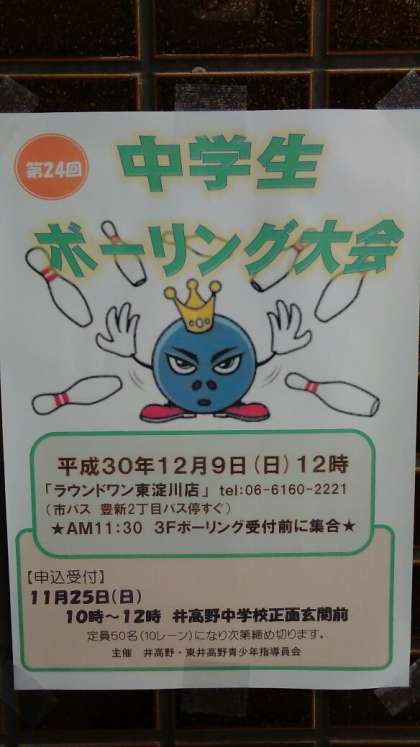 青少年指導員会主催のボーリング大会があります。参加する中学生を募集しています。