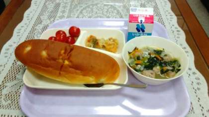 献立は、さけのマリネ、肉だんごと麦のスープ、プチトマト、パン、牛乳です。