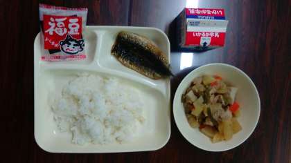 いわしのしょうがじょうゆかけ、含め煮、いり大豆、ごはん、牛乳です。