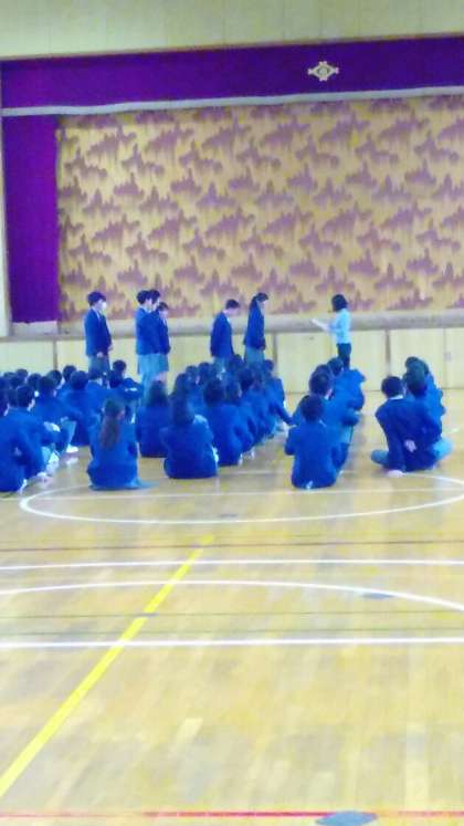 2年生の学年集会で、百人一首大会の表彰がありました。総合優勝は2組です。