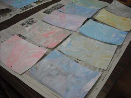 8月5日(火)美術部が井高野小学校へマーブリングのワークショップを行ってきました。最初に、美術部員が自分たちで作成した絵を使って、マーブリングの偶然にできる色と形の面白さを説明しました。その後、小学生が作成するのを手伝いながら楽しいひと時を過ごしました。