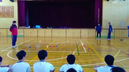2年生は、大阪体育大学の先生と大学生に来ていただいて、「ボッチャ」の実技を体験させていただきました。