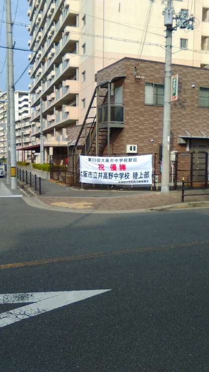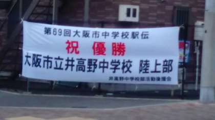 大阪市駅伝大会で優勝した陸上部をお祝いして、部活動後援会が横断幕をつくってくれました。地下鉄の出口付近に掲示してあります。